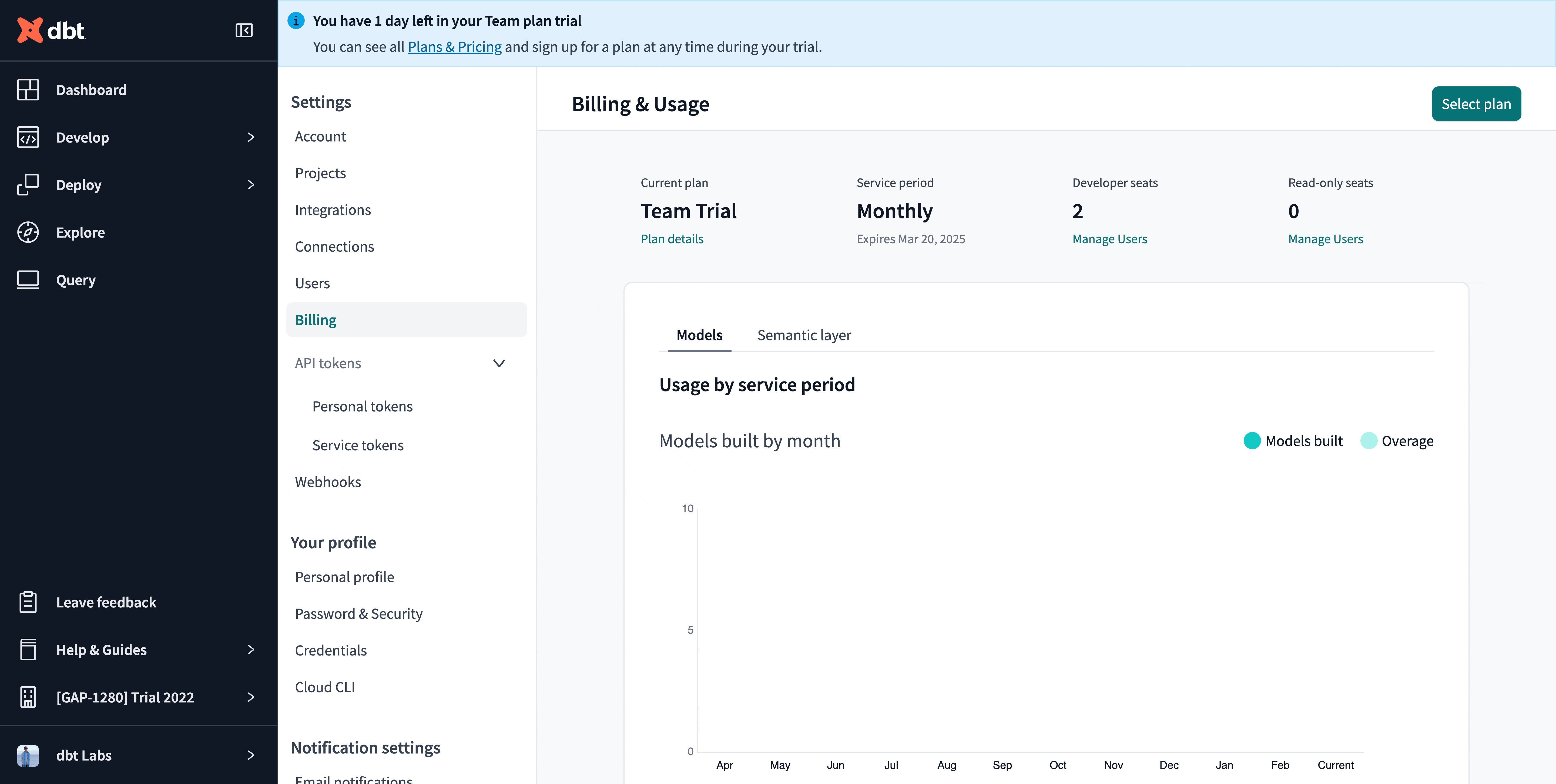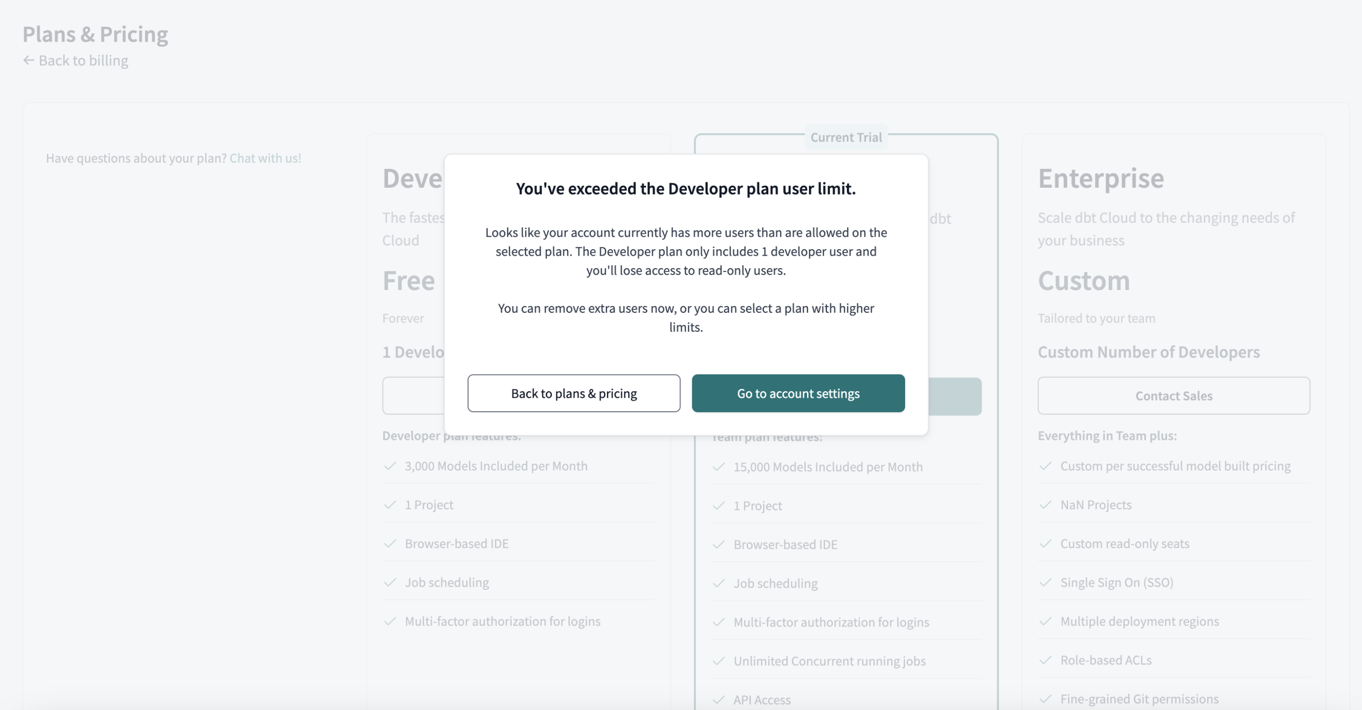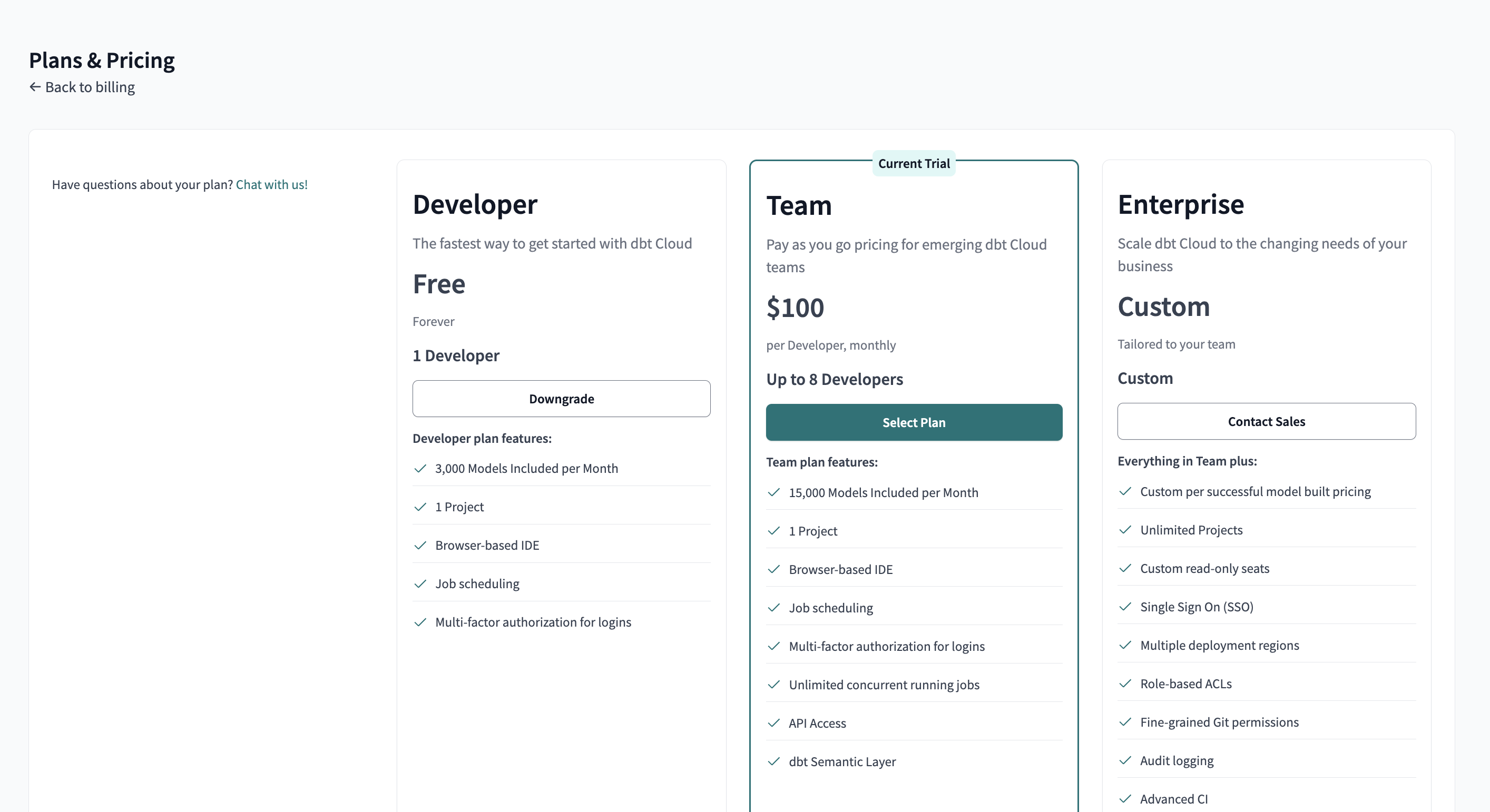 - Under Billing, you can review the available dbt Cloud plans and their features