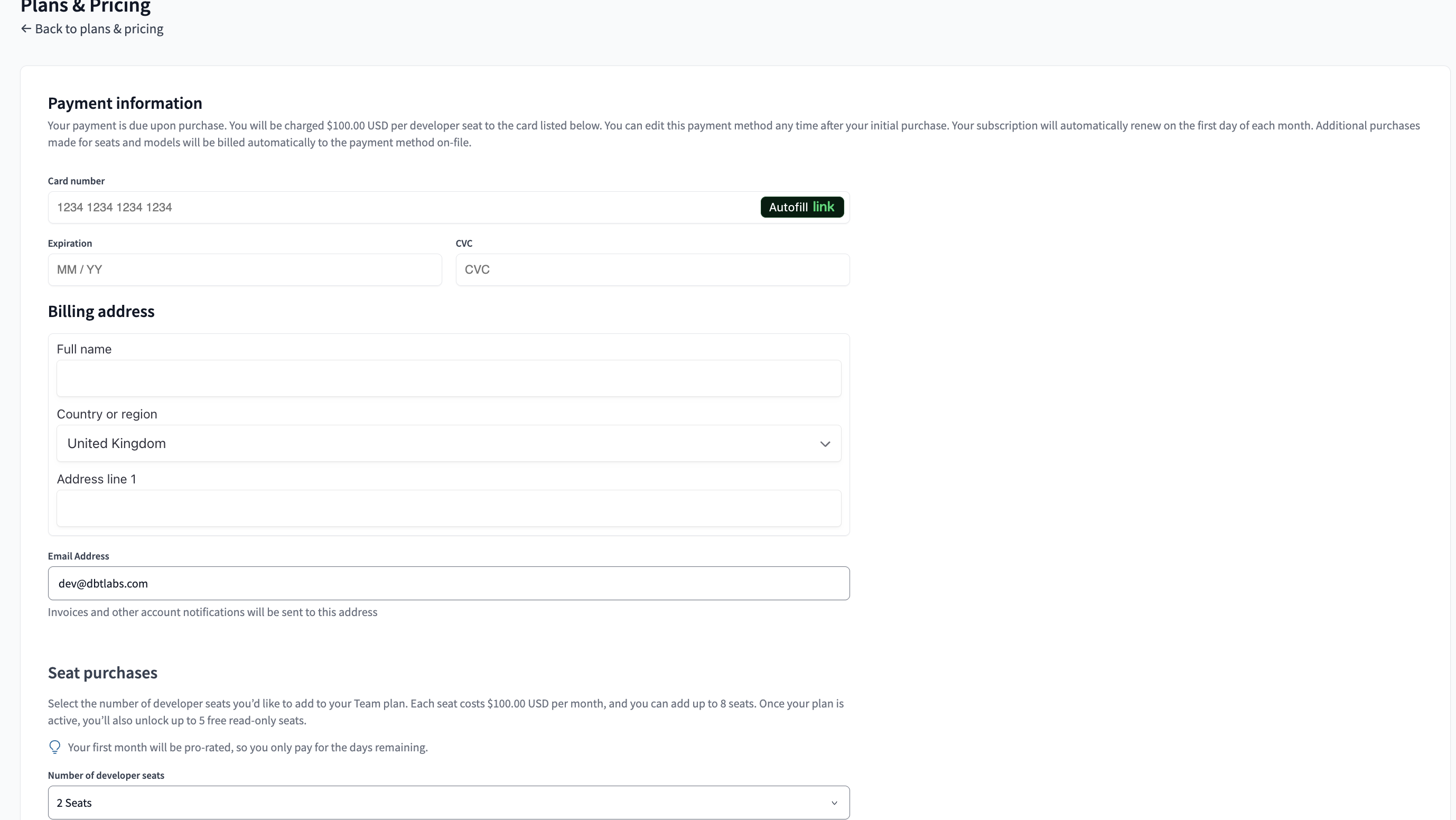 Currently, dbt Cloud Team plan payments must be made with a credit card, and by default they will be billed monthly based on the number of developer seats and usage.
